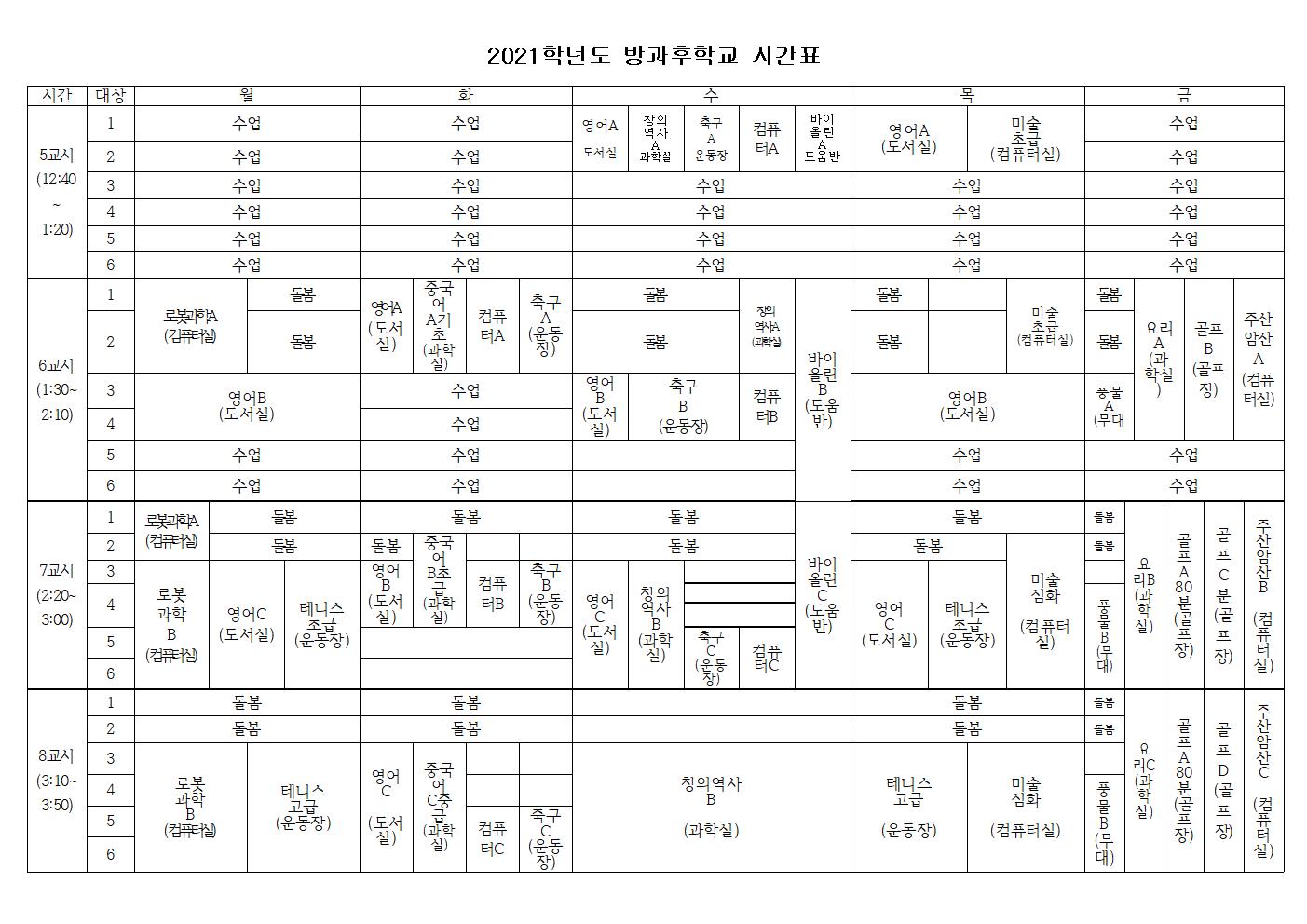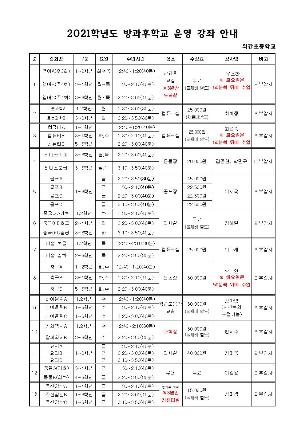 2021학년도 (3~5월) 방과후학교 운영 강좌에 장소 변경이 있어서 안내 드립니다.