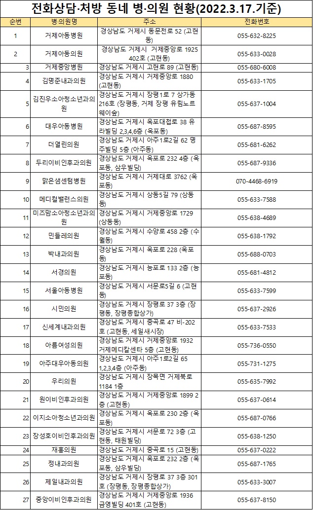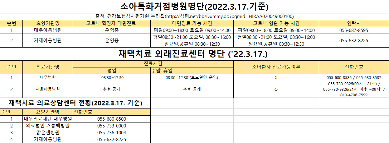 2022.3.17. 기준 소아특화 거점전담병원, 재택치료 외래진료센터, 재택치료 의료상담센터, 전화상담 동네 병의원 현황을 붙임과 같이 안내드립니다.