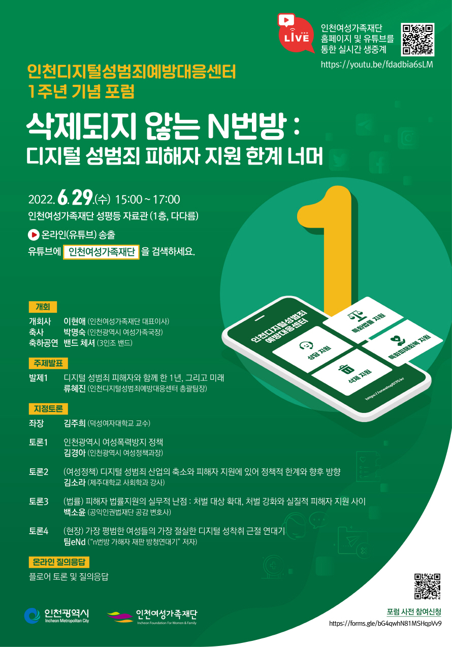 인천디지털성범죄예방대응센터 1주년 기념 포럼: [삭제되지 않는 N번방:디지털 성범죄 피해자 지원 한계 너머]를 다음과 같이 홍보드립니다.