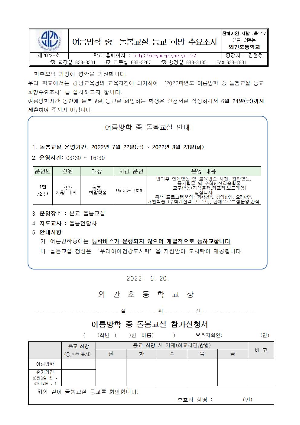 22. 초등돌봄교실 7월 운영계획안 및 식단표