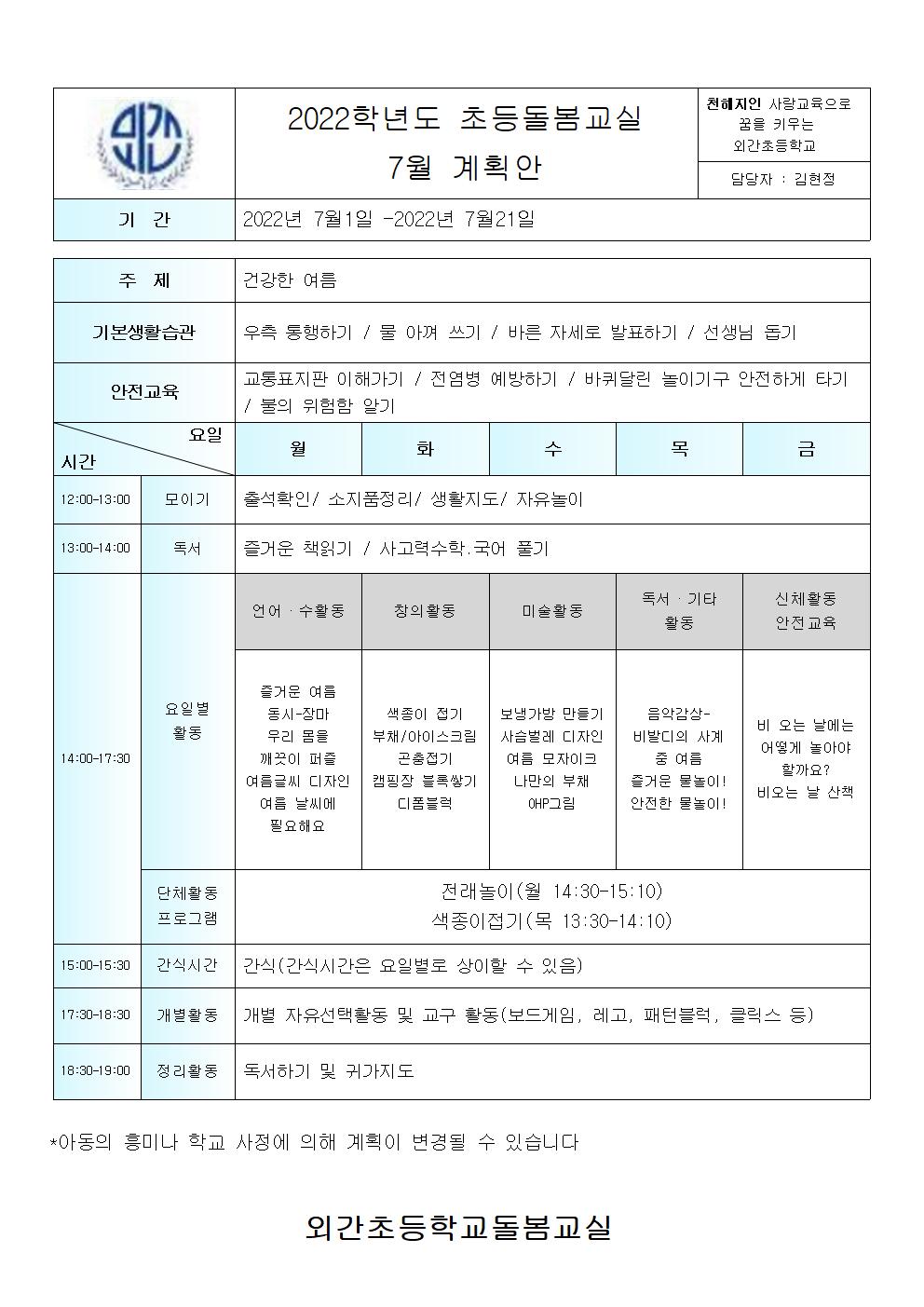 22. 초등돌봄교실 7월 운영계획안 및 식단표