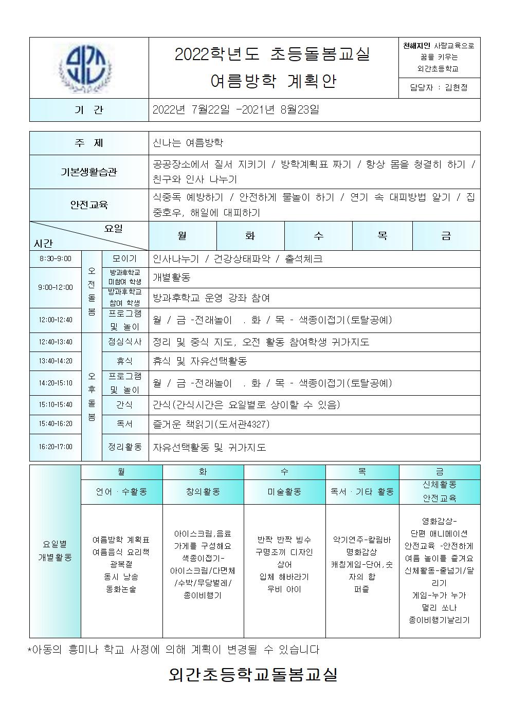 22. 초등돌봄교실 7월 운영계획안 및 식단표