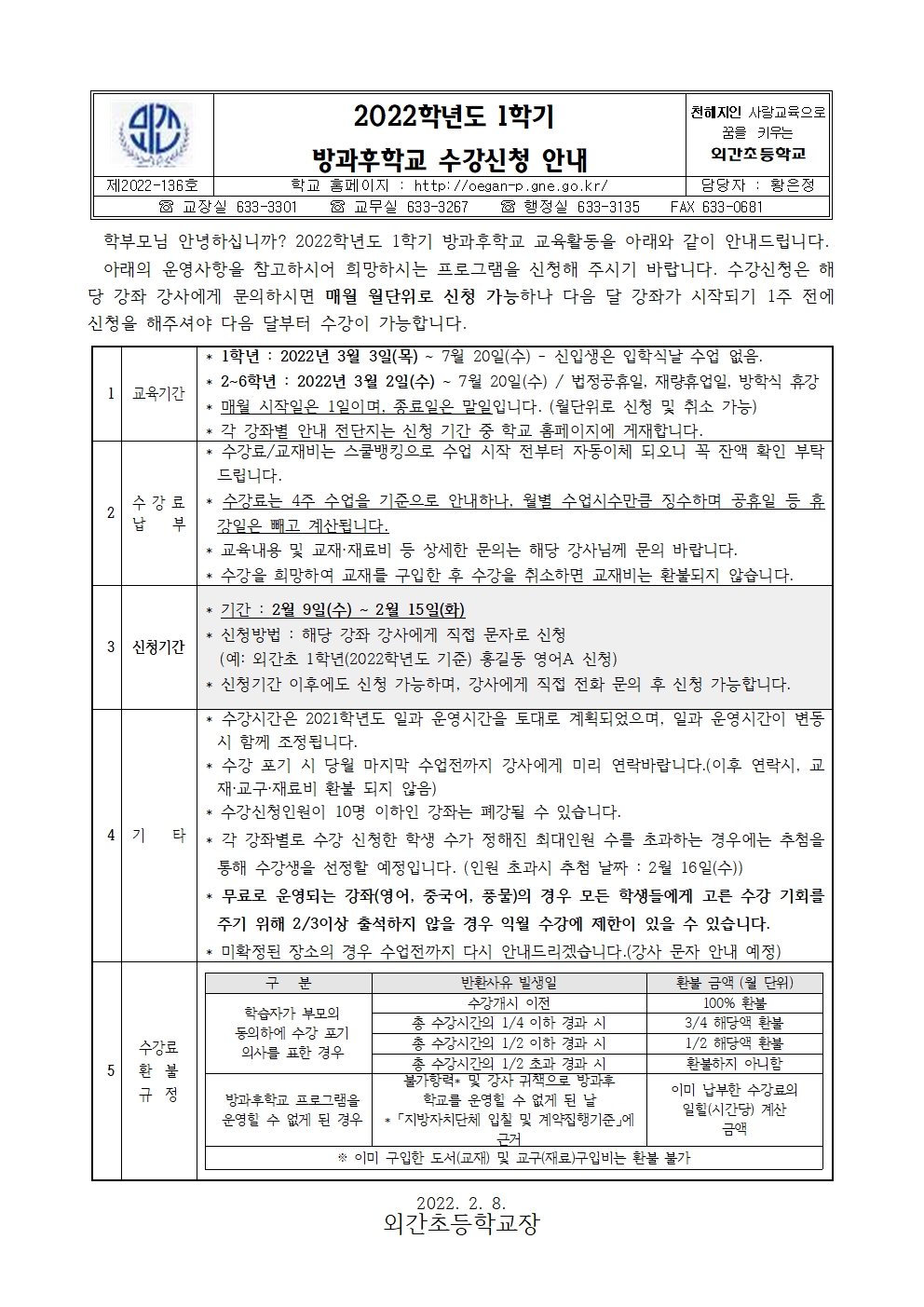 (예: 외간초 1학년(2022학년도 기준) 홍길동 영어A 신청)
