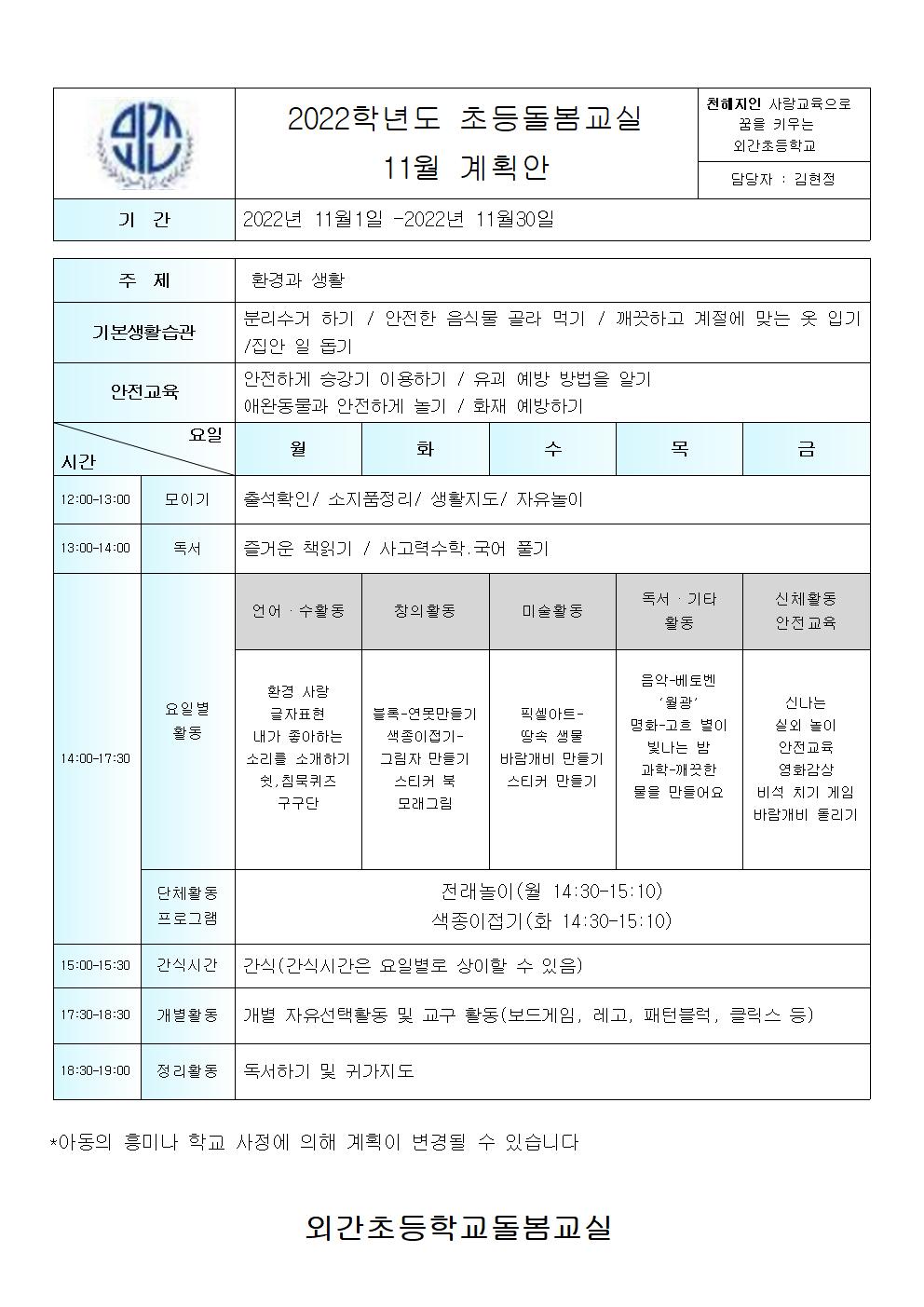 22. 초등돌봄교실 11월 운영계획안 및 식단표