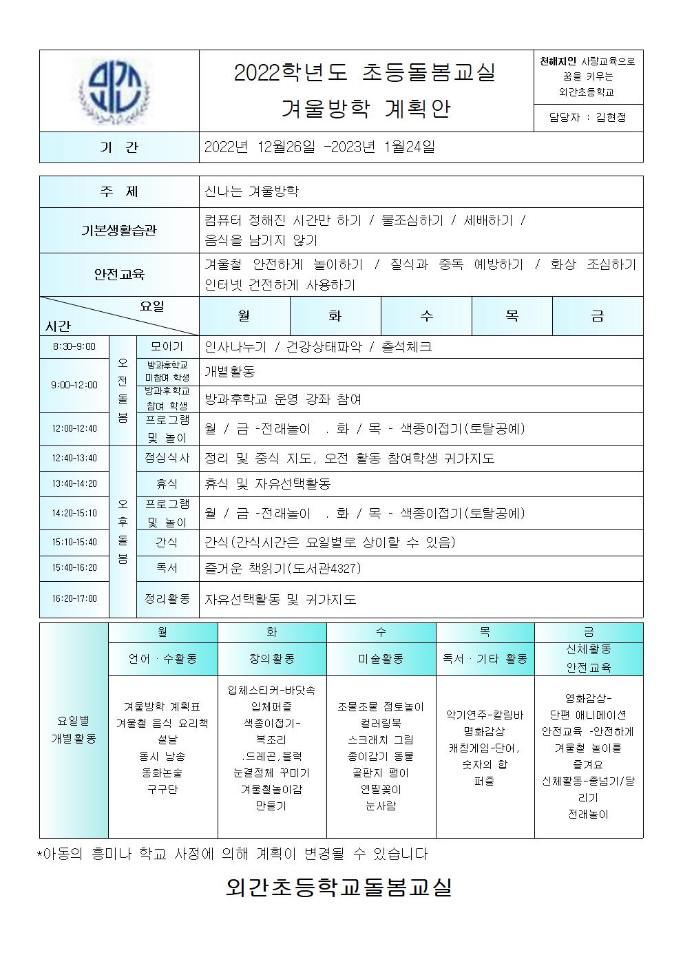 22. 초등돌봄교실 1월,봄방학 운영계획안 및 식단표