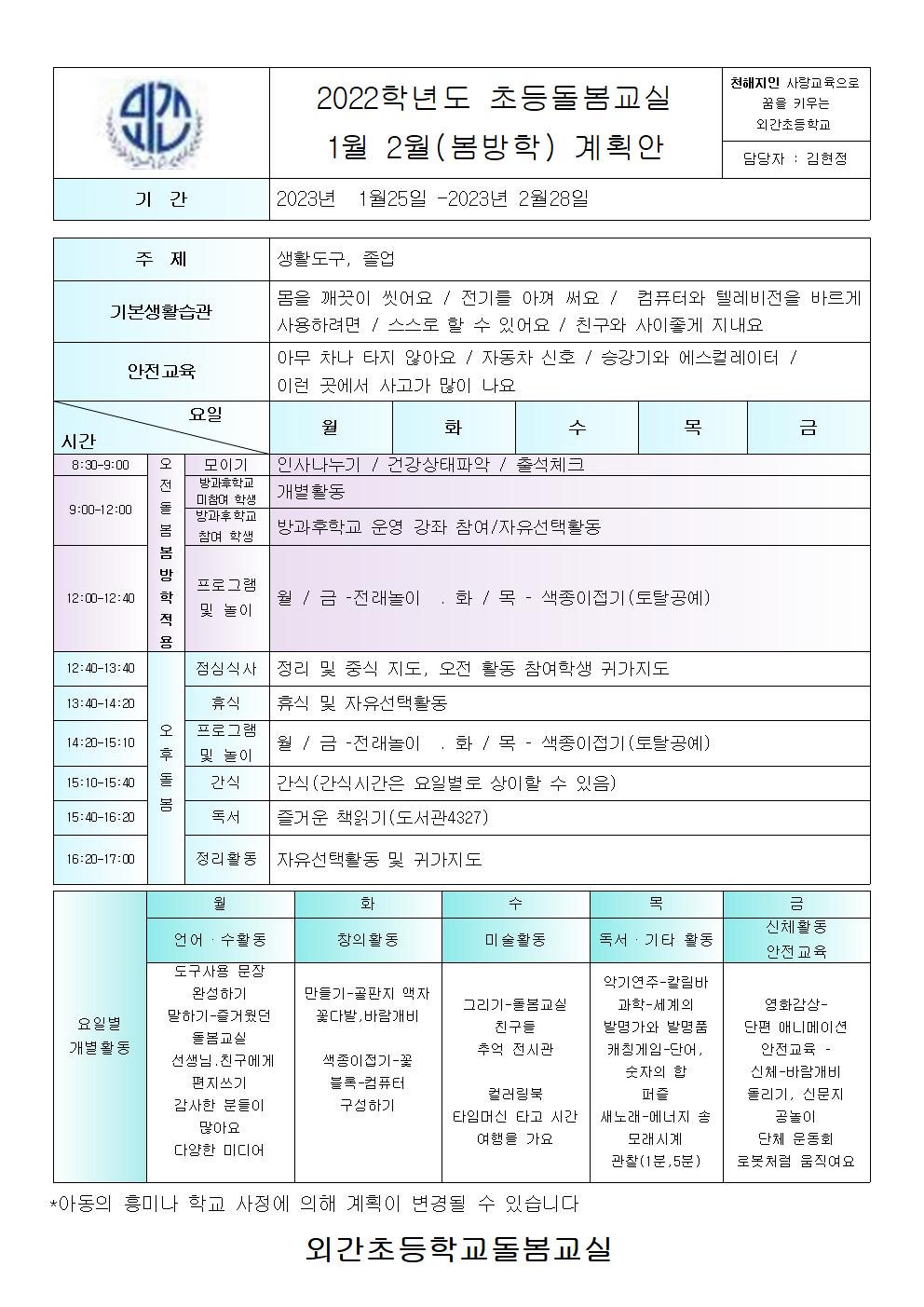 22. 초등돌봄교실 1월,봄방학 운영계획안 및 식단표