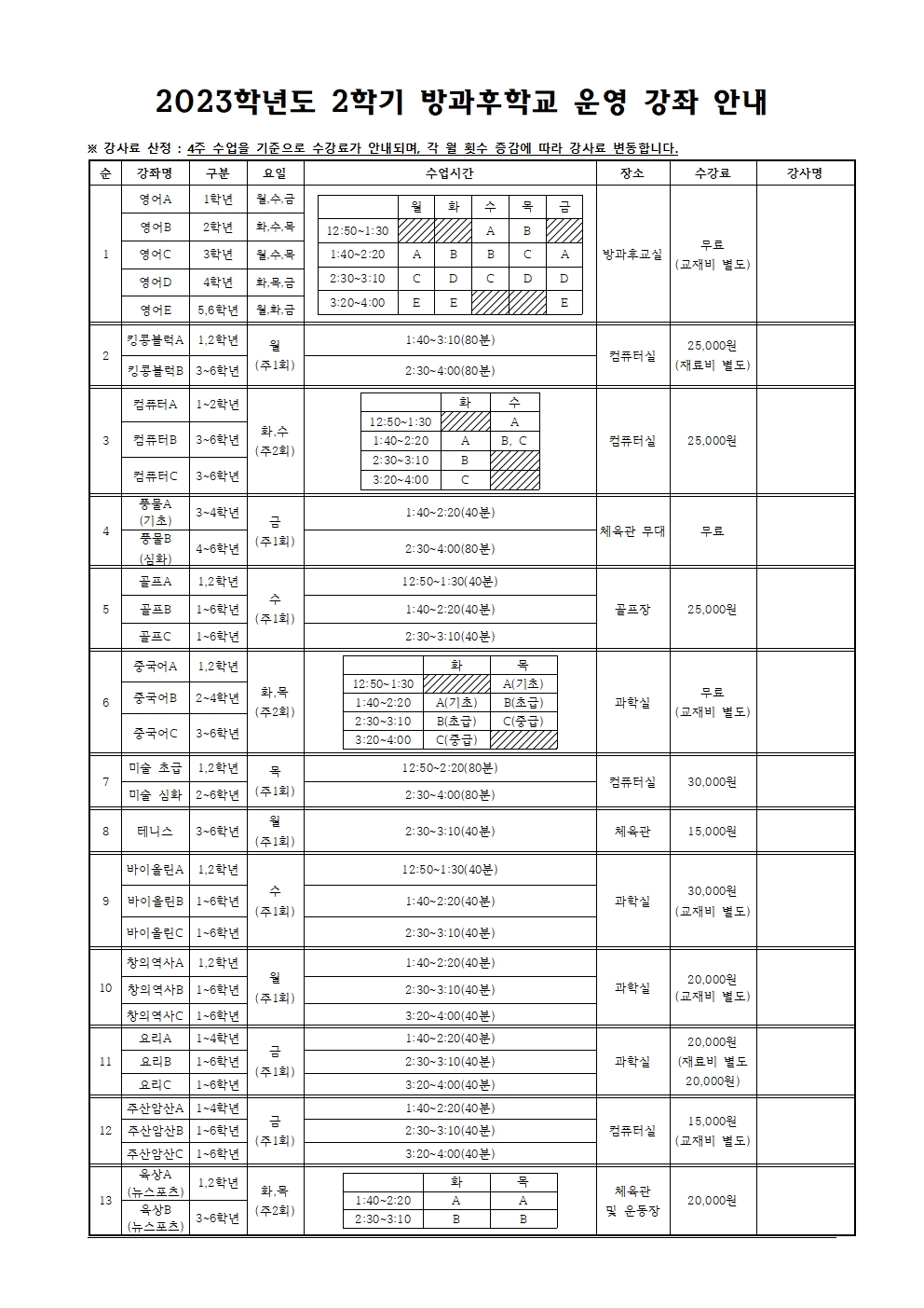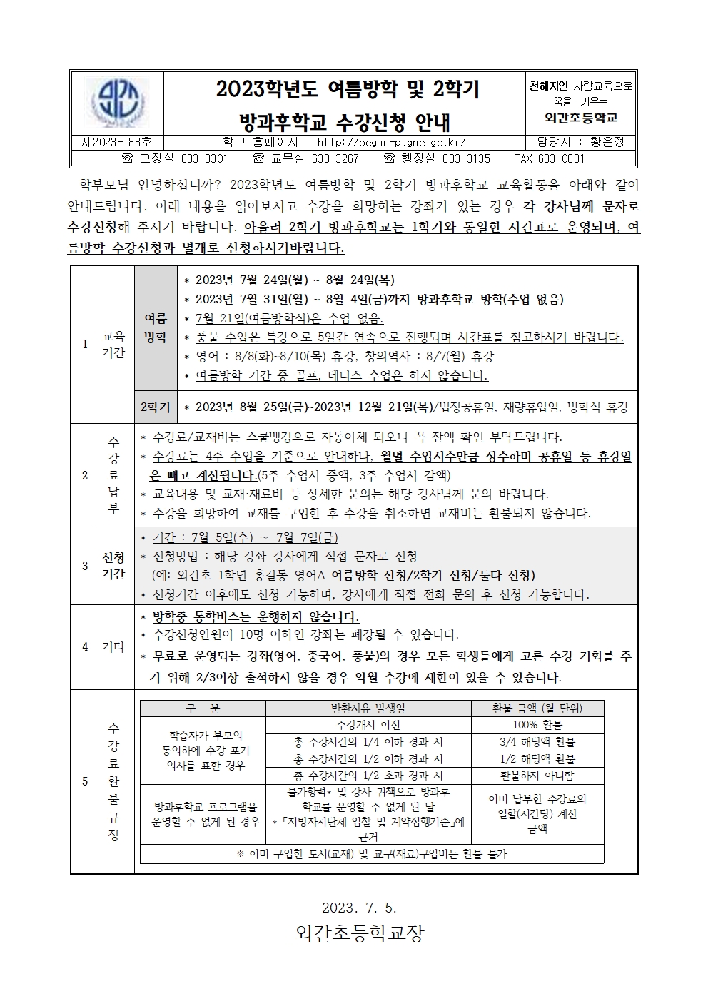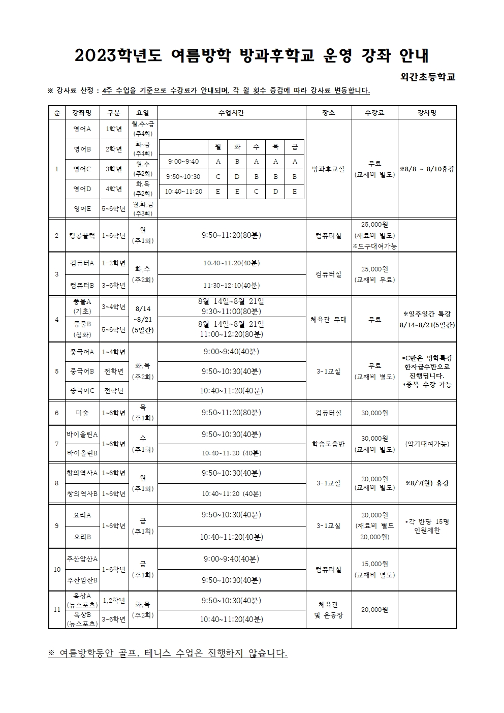2023학년도 여름방학 및 2학기 방과후학교 수강신청 안내