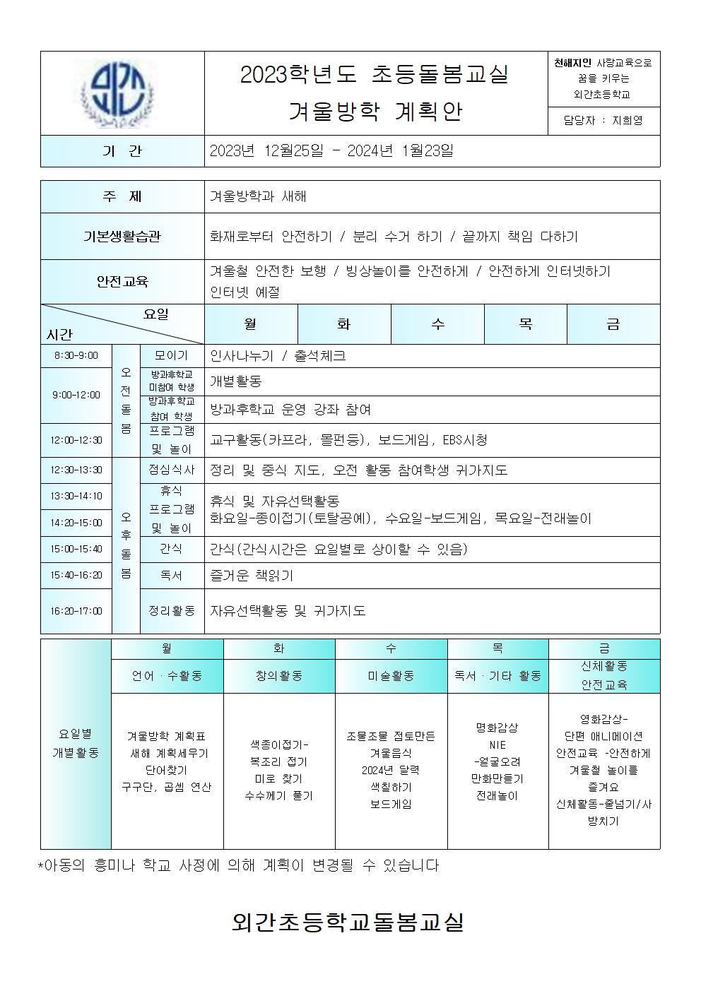 2023학년도 겨울방학*봄방학 계획안