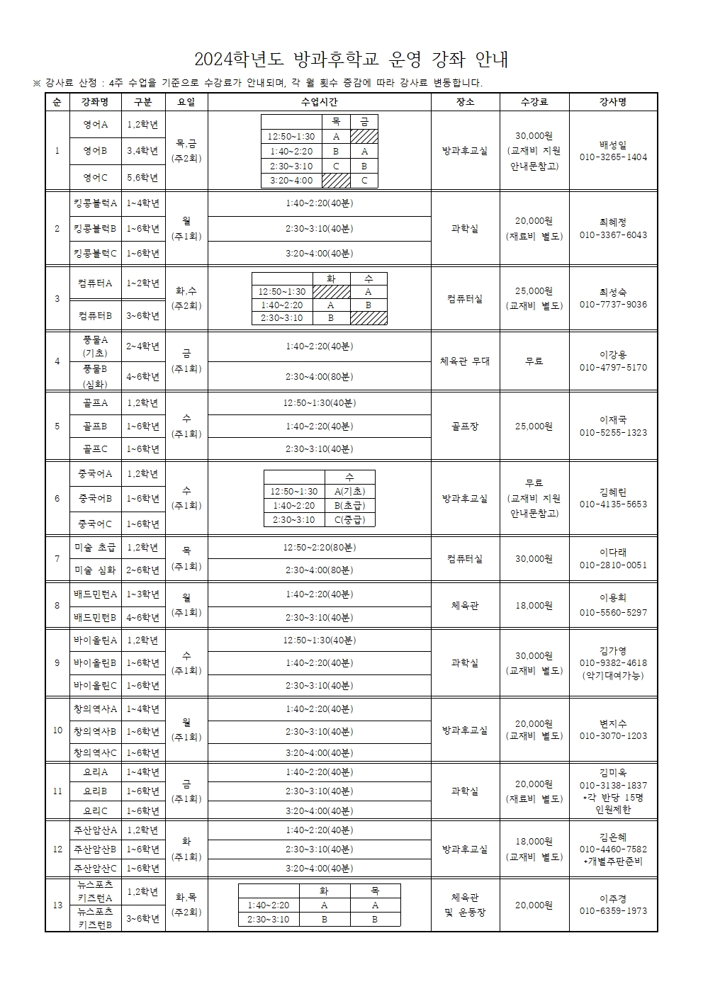 2024학년도 방과후학교 강좌별 연간지도계획안