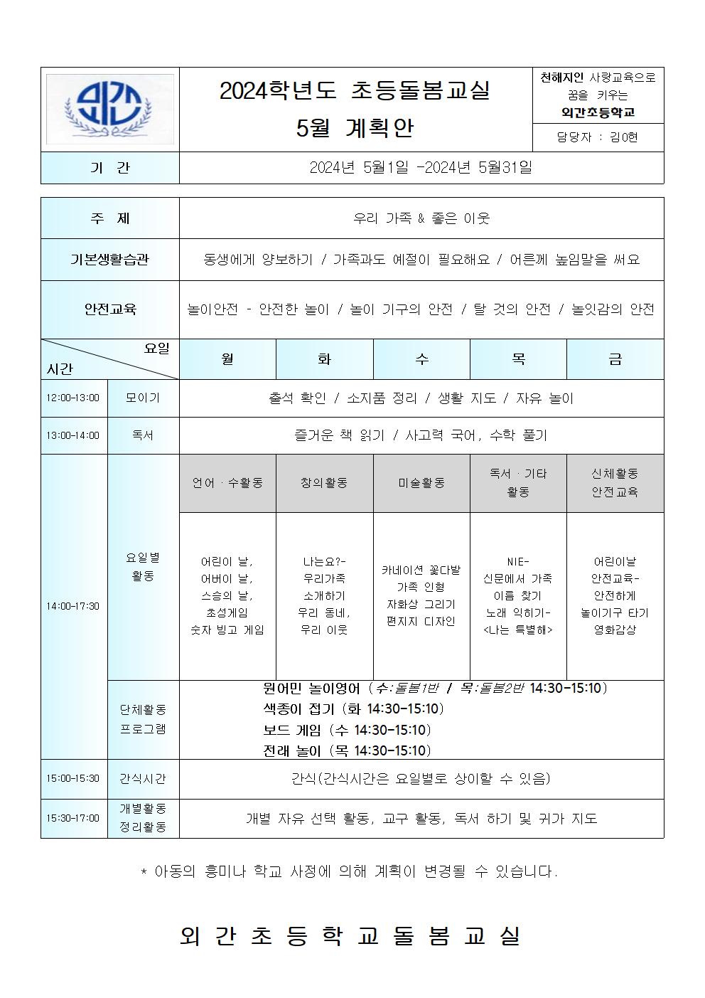 24. 초등돌봄교실 5월 운영계획안 및 간식표
