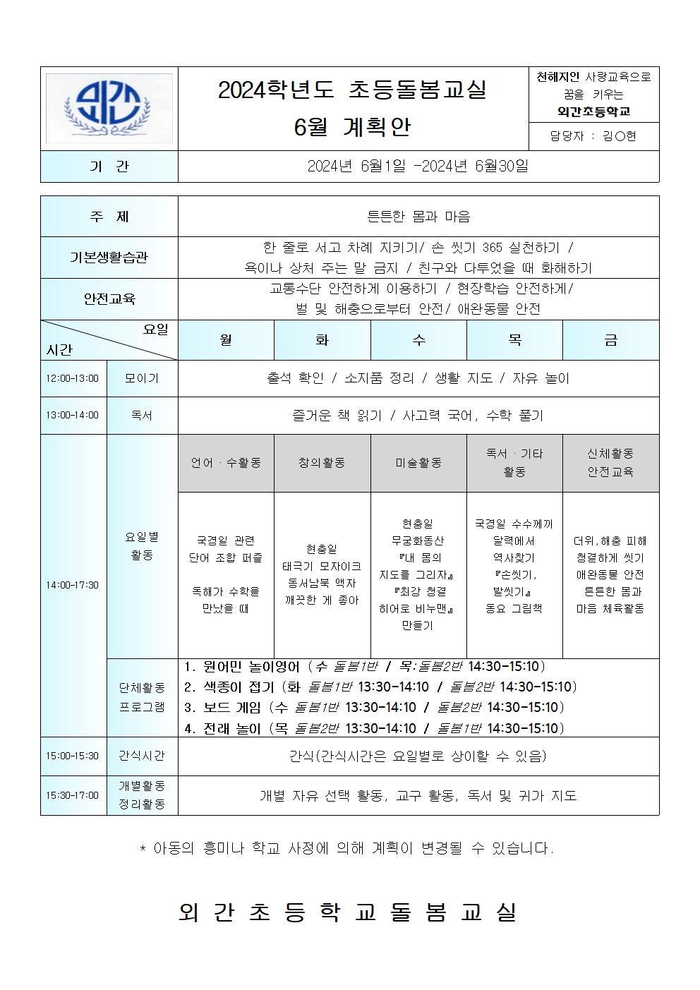 24. 초등돌봄교실 6월 운영계획안 및 간식표