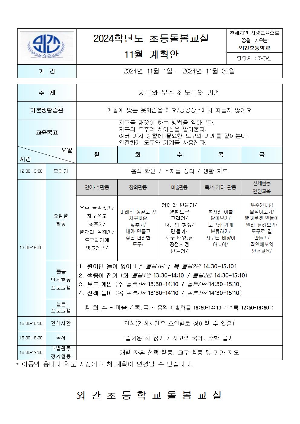 초등돌봄교실 11월 운영계획안 및 간식표