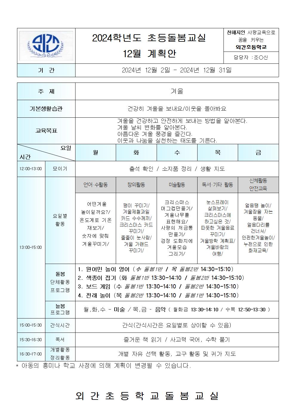 24.초등돌봄교실 겨울방학 운영계획안 및 식단표