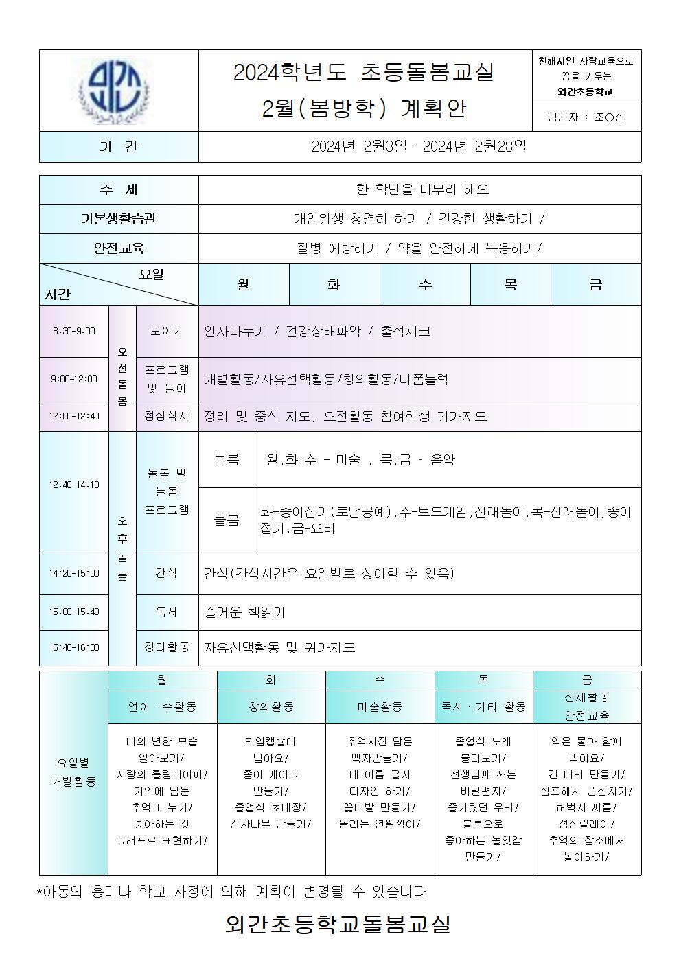 24학년도 초등돌봄교실 2월 교육계획안 및 간식표