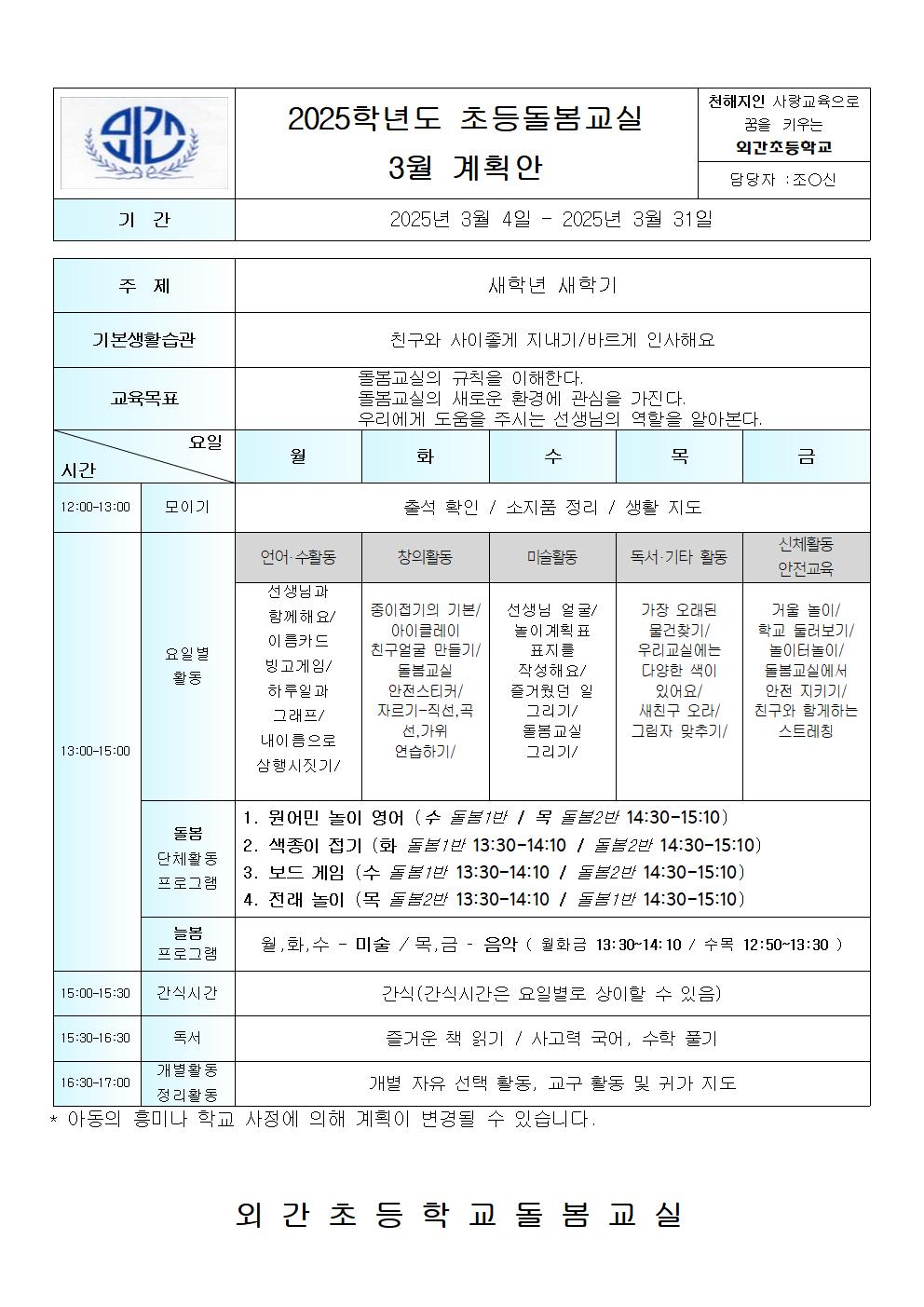 25학년도 늘봄학교 선택형 돌봄프로그램(집중돌봄) 3월 교육계획안 및 식단표
