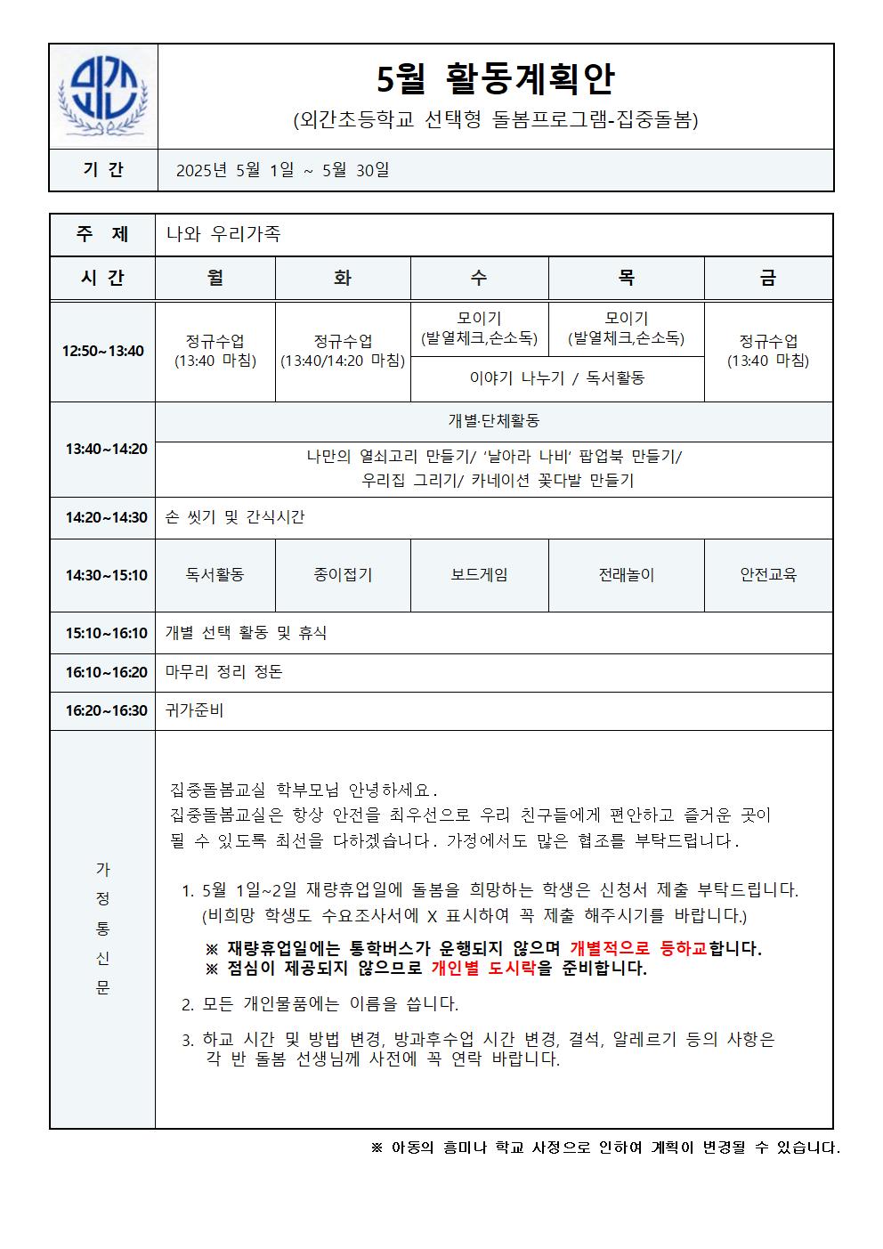 25학년도 늘봄학교 선택형 돌봄프로그램(집중돌봄) 5월 교육계획안 및 식단표