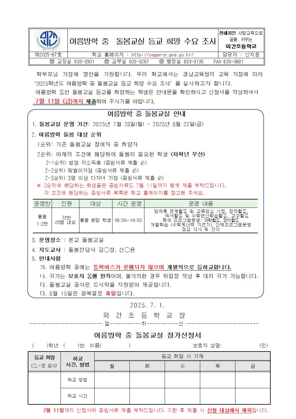 2025학년도 여름방학 중 초등돌봄교실 등교 희망 수요조사.hwp